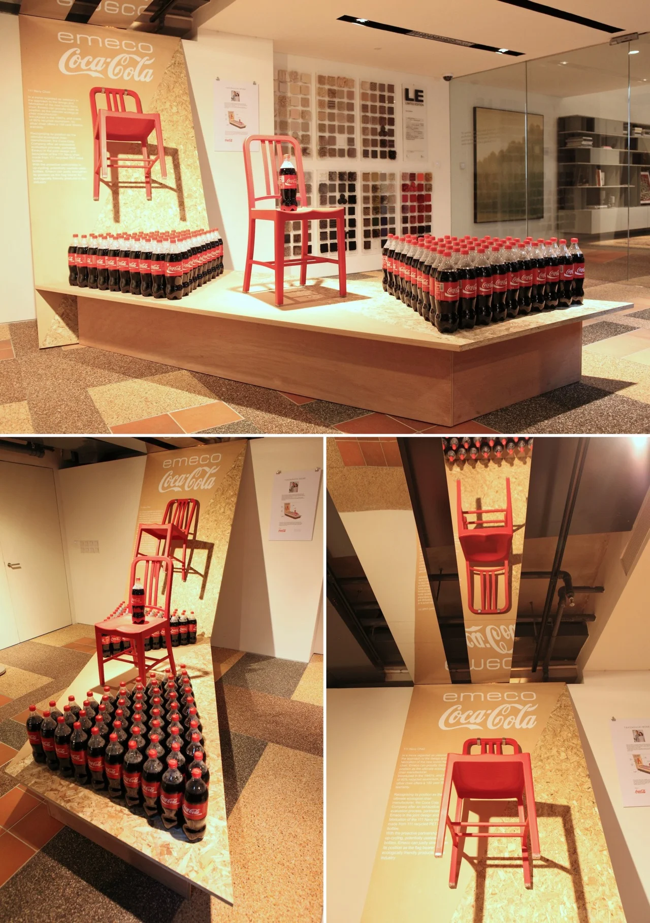 SPACE furniture asked us to participate in an exhibition at their showroom, showcasing green furniture products. We were given to Emeco 111 Navy Chair, made from 111 recycled PET bottles to display. With a small budget, using a minimum of materials, we used a combination of plywood and OSB boards, together with the 111 Coke bottles.